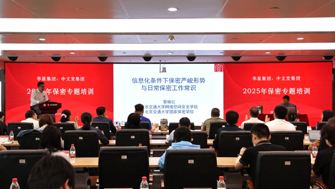为深入贯彻落实总体国家安全观,认真贯彻落实中国国新保密工作部署,扎实推进保密宣传教育月活动,进一步增强全体干部员工保密意识,提升保密工作能力,5月14日,华星集团、中文发集团联合举办保密专题培训。本次培训邀请北京交通大学国家保密学院黎妹红教授进行授课,华星集团总经理,中文发集团党委副书记、总经理韩剑主持活动并讲话。